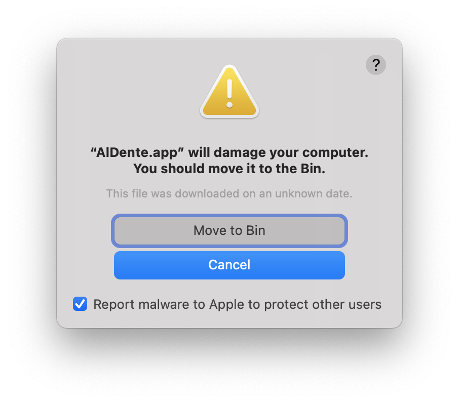 macOS now reports AlDente as malware and prompts me to move the application to the bin, but I think this is a false positive based on the source code here.