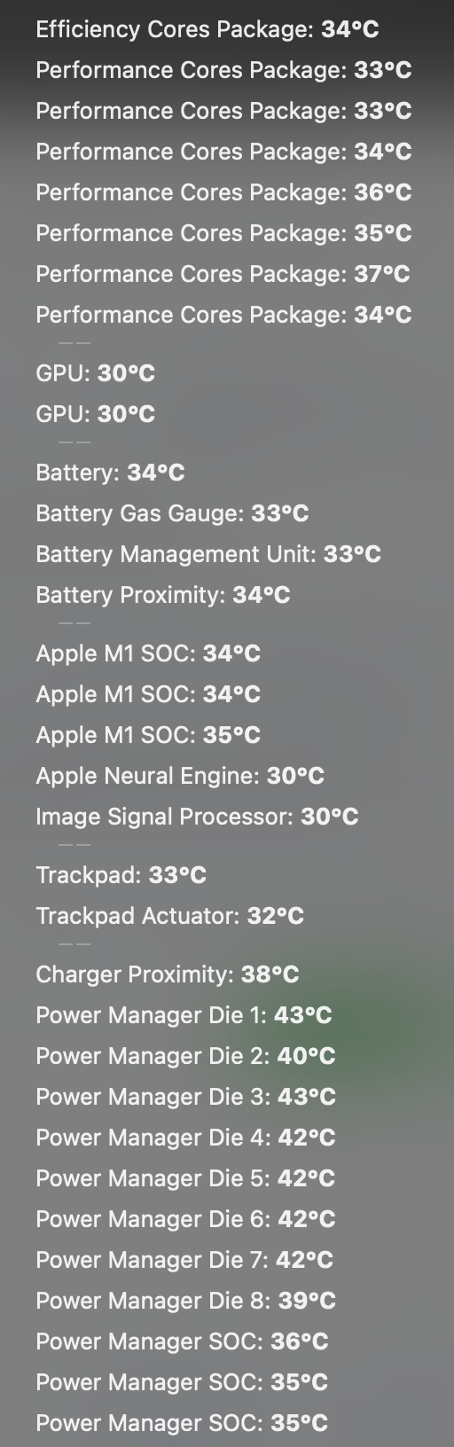 If this is useful information, I use TG Pro for my temp monitoring and my current ambient room temp is 28C with my M1 CPU and battery avg. temps are sitting constantly at 34C and my power manager dies are around 41C.