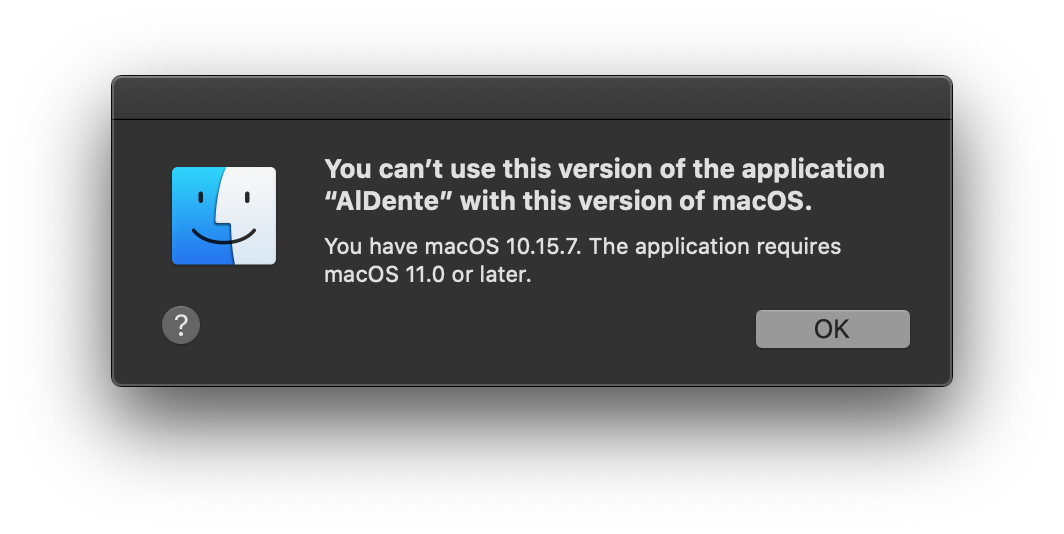 Due to the limitations of SwiftUI AlDente is only compatible with macOS 11.0 or newer. You either have to update your MacBook to macOS 11 or you can download AlDente Classic 2.2 which is an older version of AlDente but it doesn't work as well as the newer versions of AlDente.