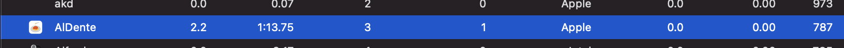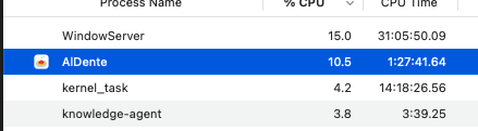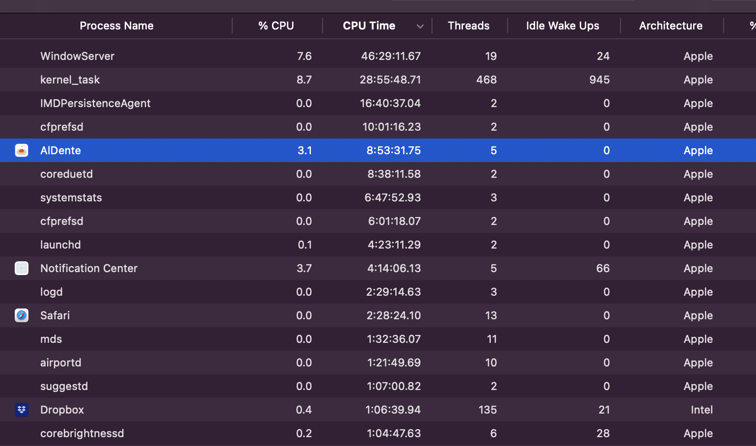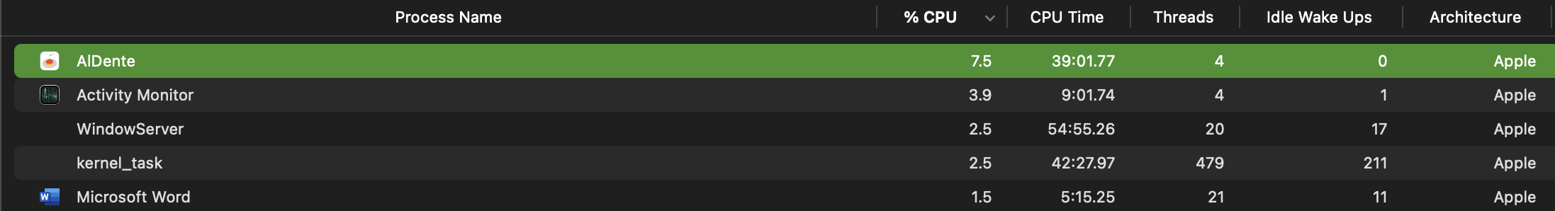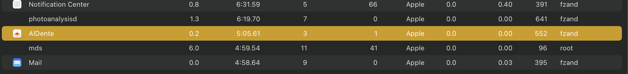 I just wanted to jump in and update on my M1 Macbook Pro. Usually I just turn off AlDente while I'm not charging to avoid this issue. I wanted to test and see if I could still observe the issue, so I let the app run for 24 hours consecutively. When first starting, CPU usage is reasonable (usually 0.x%). After 24 hours CPU usage bounces between 6% and 20% (!!) with over 31 hours of CPU time over the last 12 hours (more than my web browser in the same period).