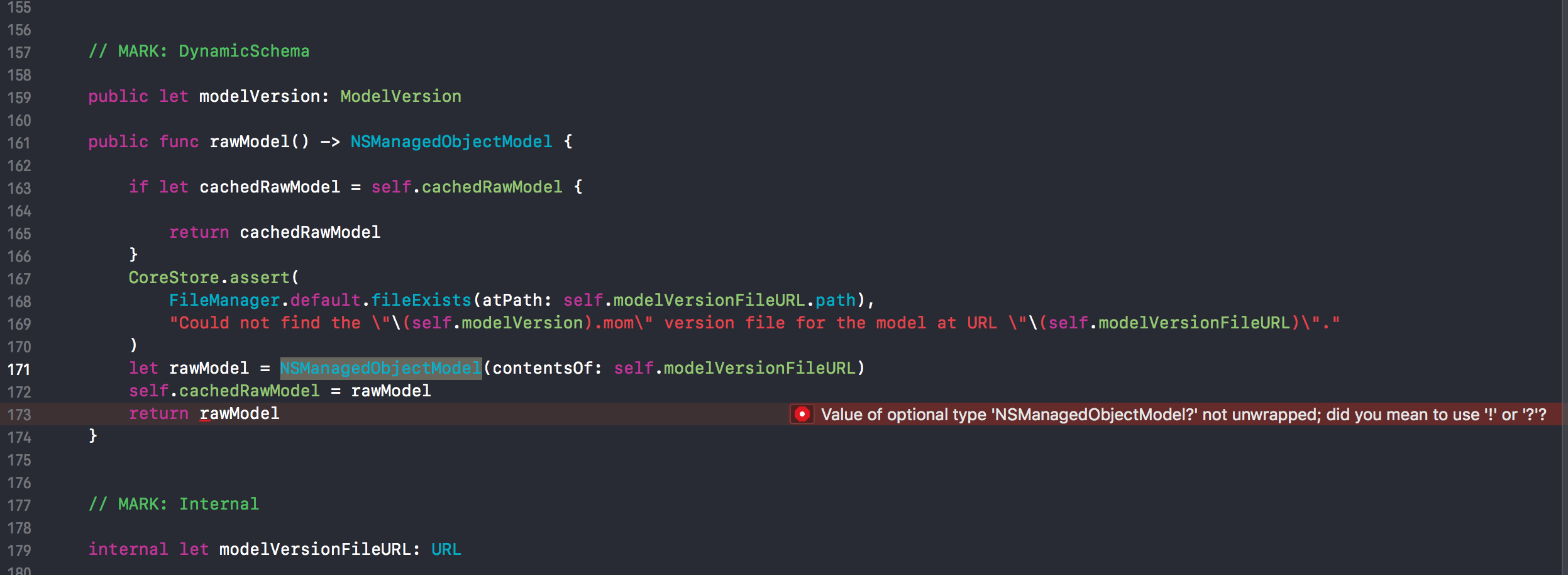 NSManagedObjectModelconstructorconvenience init?(contentsOf url: URL)returns an optional value but the function is expecting a nonoptional value.It seems that Xcode9 beta5 wasn't picking up this error for some reason. Xcode8 compiler will complain as expected.