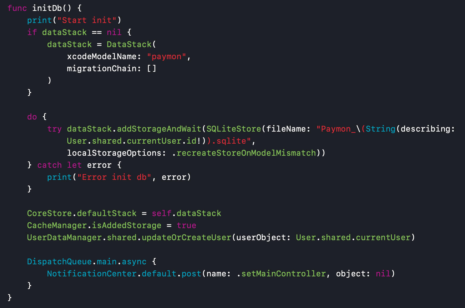 DataStackused by your old account. Your old code was fine: https://github.com/JohnEstropia/CoreStore/issues/281#issuecomment-442388594Your issue in #281 is not the database setup code. You have other processes in your app that still use the old DataStack. They may be View Controllers, or something else. That's what you should focus debugging, those objects need to be deallocated before you call