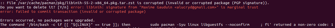 The command '/bin/bash -c if ; then sudo pacman -Syu linux libguestfs --noconfirm ; fi' returned a non-zero code: 1