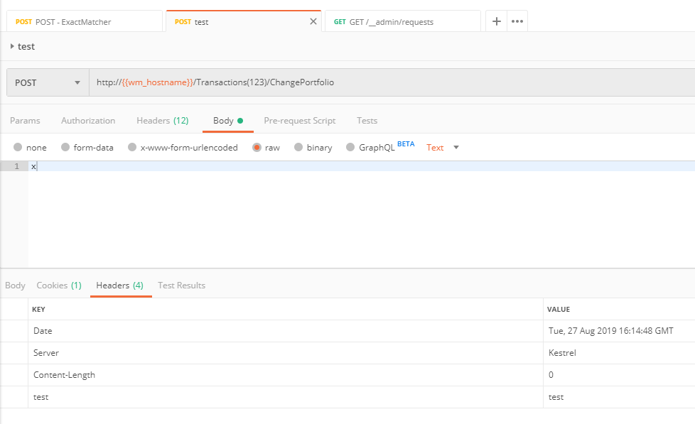 http://{{wm_hostname}}/__admin/requeststo see all requests + the RequestMatchResult which shows you which items do match. Maybe in your case the body is not matched correctly?@PkAIR commented on GitHub (Aug 27, 2019):