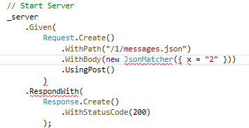 .WithBody(new JsonMatcher({ x = 42, s = "s" }))Above line throws a syntax error. It should be: