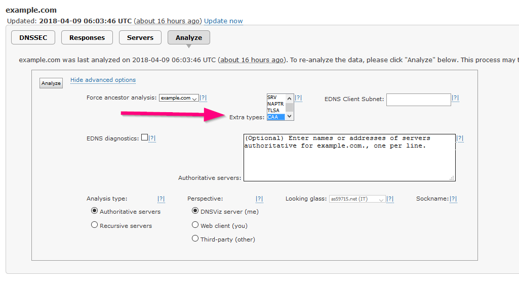 digging. DNSviz was also immensely helpful. Make sure to check the CAA line in the advanced options (screenshot below). This turned up the missing signature.Also: the target domain of a CNAME may need its own CAA record, I can't say for sure if this solved it, because this happened somewhere along the way.