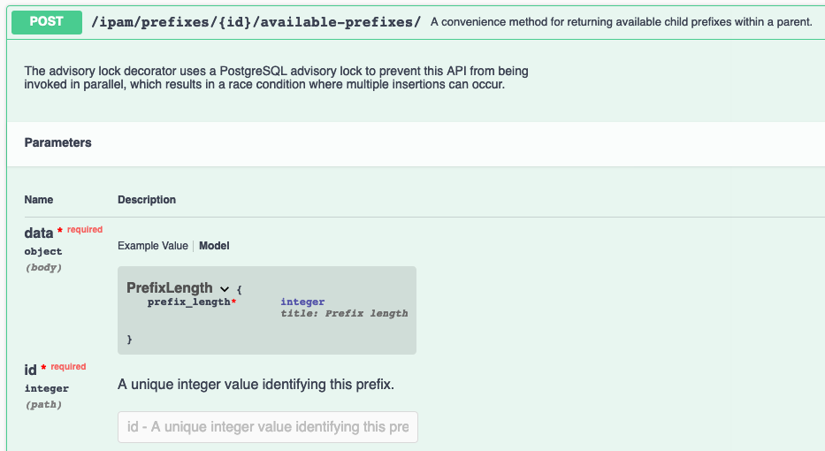 /ipam/prefixes/{id}/available-prefixes/API endpoint is asymmetric in terms of what serializer it uses forGET(PrefixSerializer) versusPOST(PrefixLengthSerializer). By adding an appropriate implementation ofget_serializer_classwe can reflect this asymmetry and ensure that the Swagger API docs are correctly generated:🔄 This issue represents a GitHub Pull Request. It cannot be merged through Gitea due to API limitations.