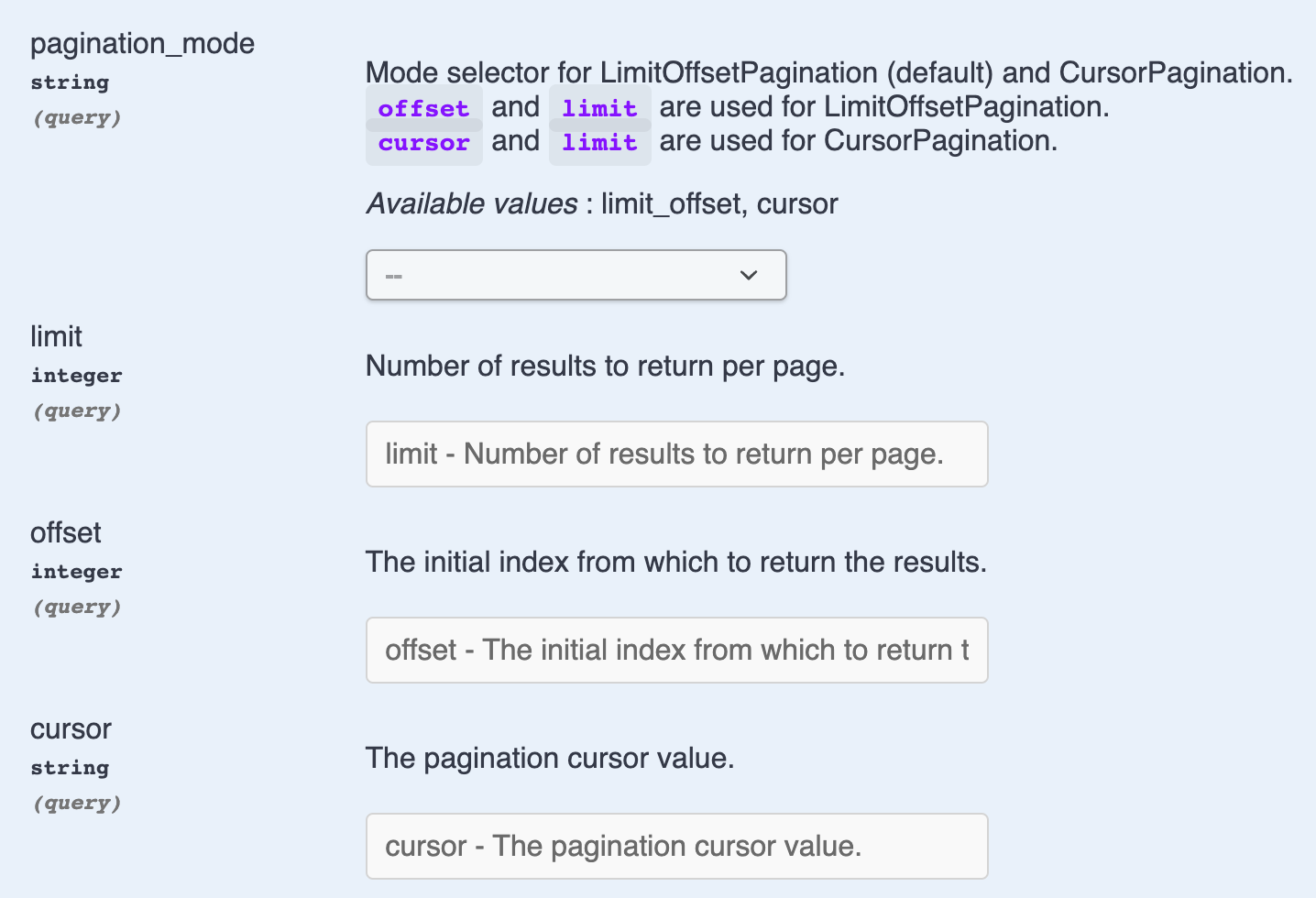 TwoModePaginationto support both Cursor Pagination and Limit Offset Pagination (default). The client can now specifypagination_mode=cursorto use Cursor Pagination. Please see Swagger UI for more information.CursorPaginationWithNoLimitfollowsOptionalLimitOffsetPaginationand allows the client to turn off limit by specifyinglimit=0. Most of the code is copied from the stock implementation ofCursorPagination.🔄 This issue represents a GitHub Pull Request. It cannot be merged through Gitea due to API limitations.