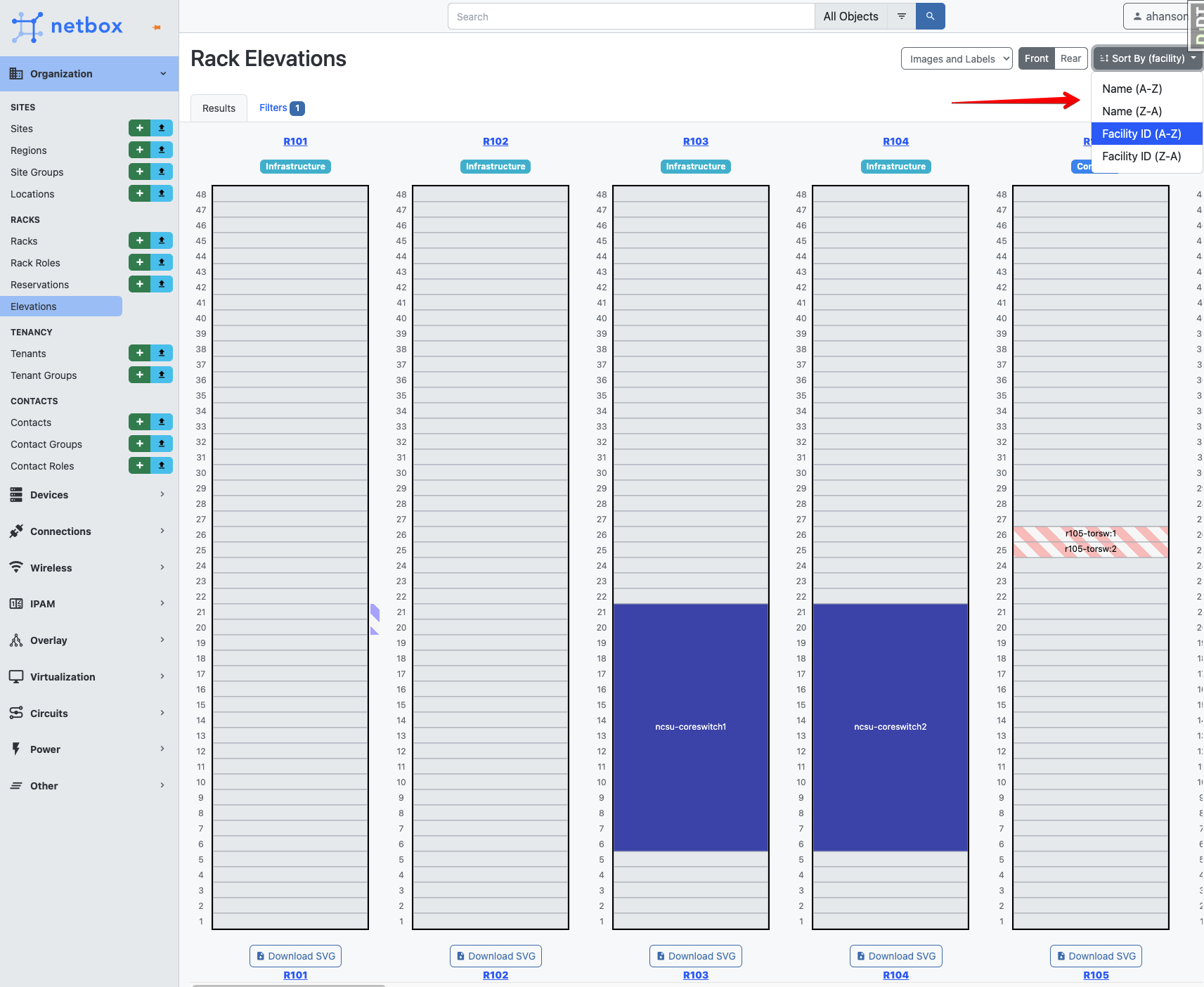 On Rack Elevation list add a "Sort By" dropdown in-place of the buttons, with options "Name (A-Z)", "Name (Z-A)", "Facility ID (A-Z)", "Facility ID (Z-A)"