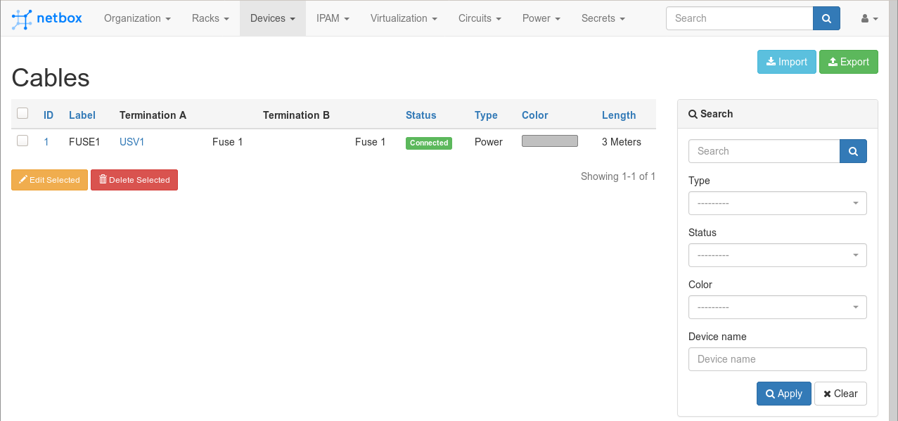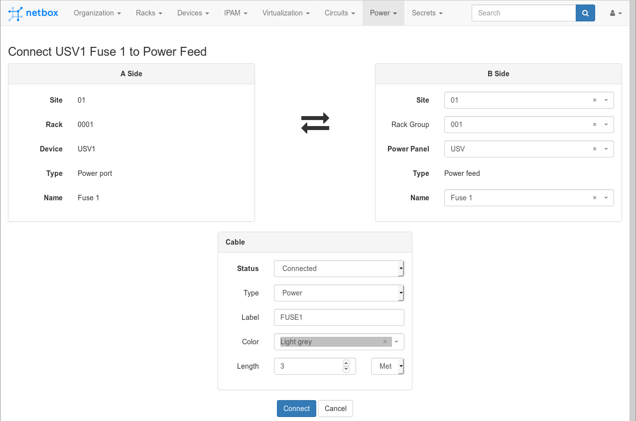 Device Power Portand aPower Feedhas no clickableTermination B(the Power Feed) and is not editable via Cables [Edit selected].Device