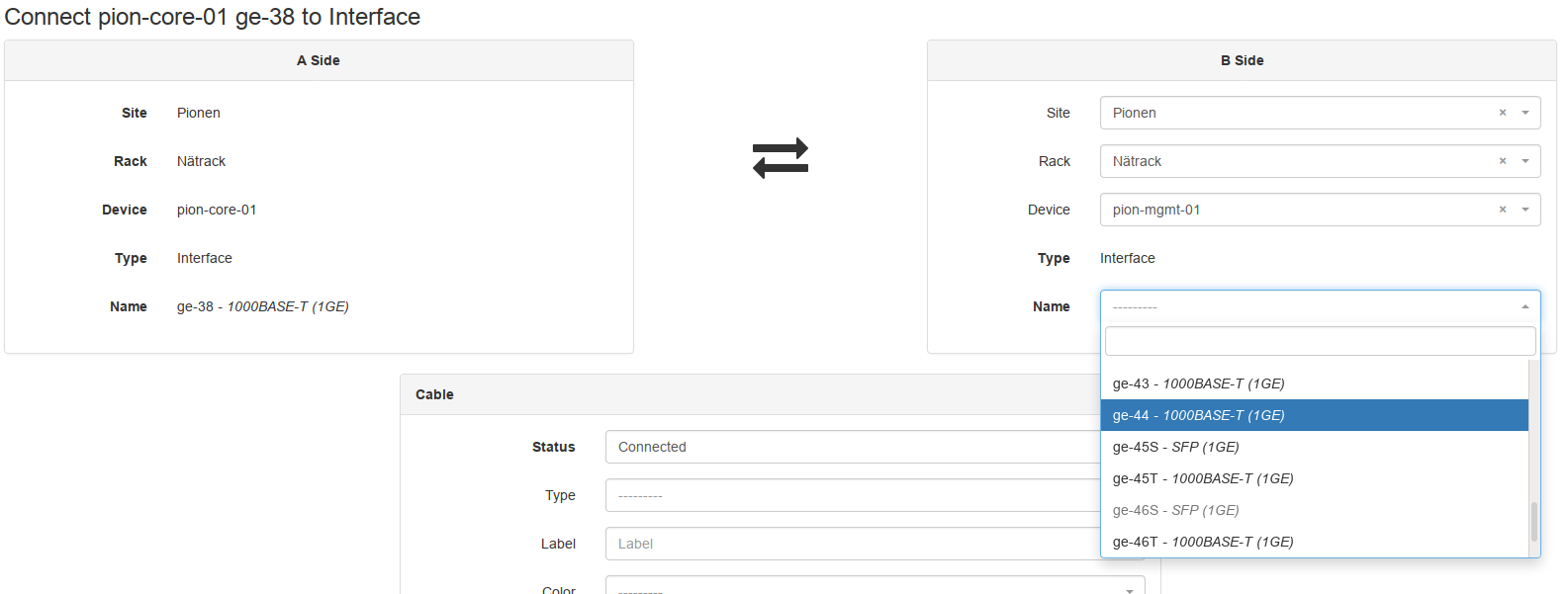 The cable connection display currently only shows the direct names of interfaces/ports, it would be useful to also include the type of the interface/port in both the source and the target selection as well.