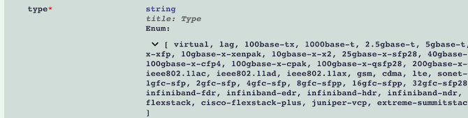 curl localhost/api/dcim/interfaces/returns all the interfacescurl -XOPTIONS localhost/api/dcim/interfaces/doesn't return the choices data:To see the available interface choices, I have to provide a valid API token.