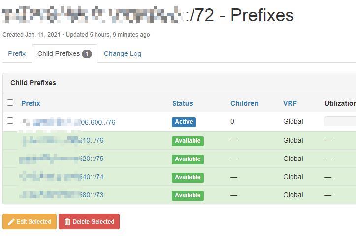 In IPAM→Prefixes,I add a ipv6 Prefixes,like 1424:876C:C0:171::/72,i choose "1424:876C:C0:171::/72", add a Child Prefixes(/76:1424:876C:C0:171::/76).