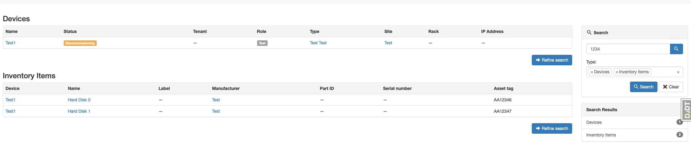 My users want to be able to search for inventory items and devices via one screen. Currently, because inventory items are not included in the search scope (due to efficiency concerns I believe), given an asset tag, they need first to search for this in the main search box and, assuming it returns no results, search again for it in the inventory items page. This is unwieldy. While it is understandable that some instances of NetBox will have many many thousands of inventory items and therefore searching them all every time is inefficient, this should be for the application administrator and/or the user to decide based on the types and quantities of data stored in their own instance.