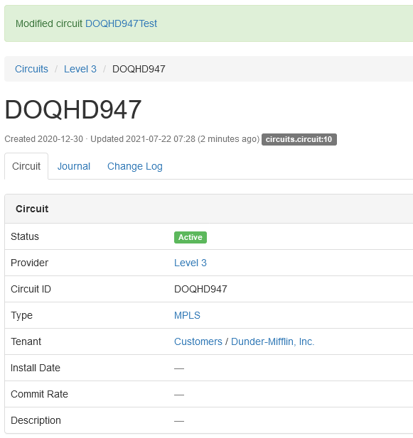 Green banner at the top of the page indicates circuit has been modified successfully, however, circuit details have not changed.