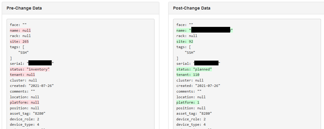 When recording a change, NetBox serializes only attributes of the object itself. This is done both as a performance optimization and to ensure the integrity of the data (primary keys never change). For example, if a device's