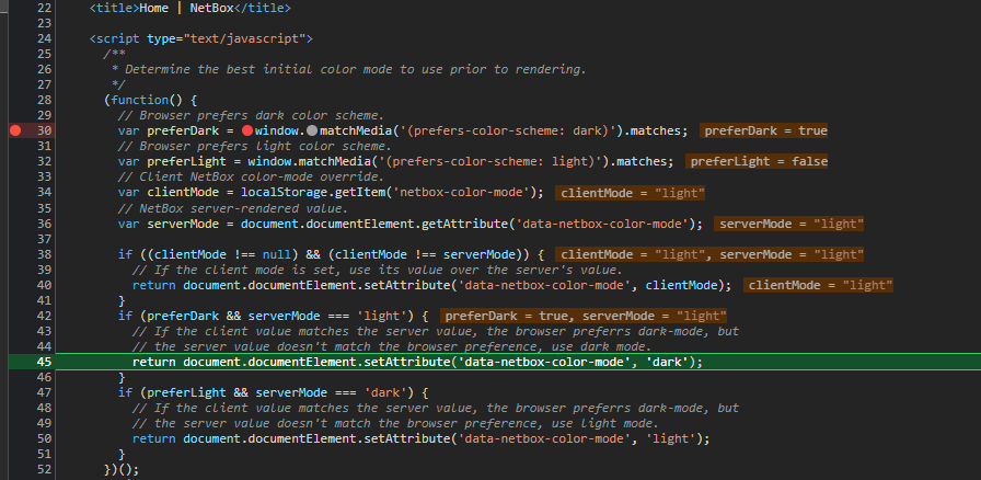 System theme is only followed one time after netbox-color-mode is deleted after which it will stick. When stepping through the Javascript, it reaches line 45 where the theme flashes dark then back to light: