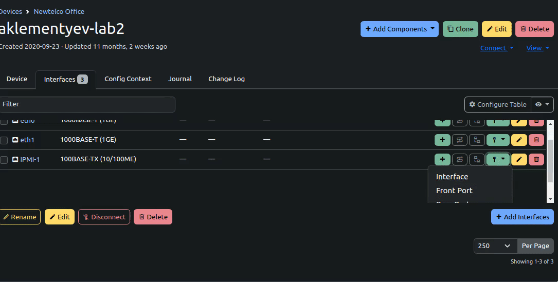 Go to a device with interfaces and select the "connect" dropdown. This will give the user a choice of "Interface", "Front Port", "Rear Port", "Circuit Termination". However, this dropdown will cause the interior of the table of interfaces to scroll if the table is shorter the amount of choices in the dropdown, i.e. if there are only 2-3 interfaces.