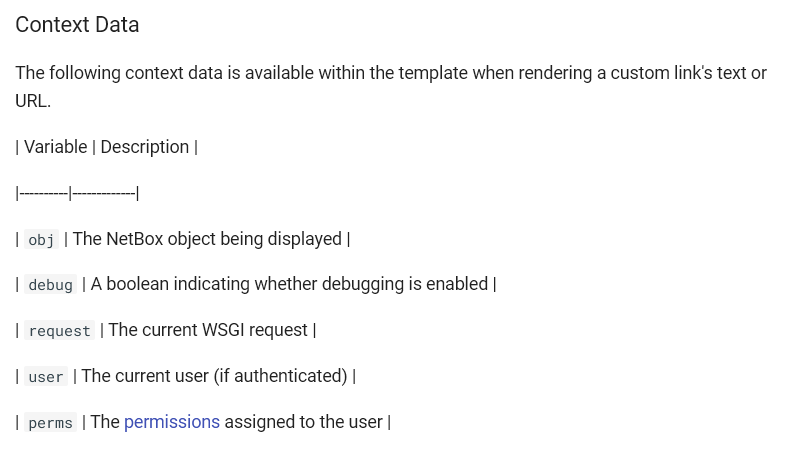 Following #7367 I checked the live custom links page at ReadTheDocs.io to see if my change got through (exciting!) and noticed that the markdown table in the Context Data section is not rendering properly. I don't think it's my machine - tried two browsers - but just in case, this is what I see: