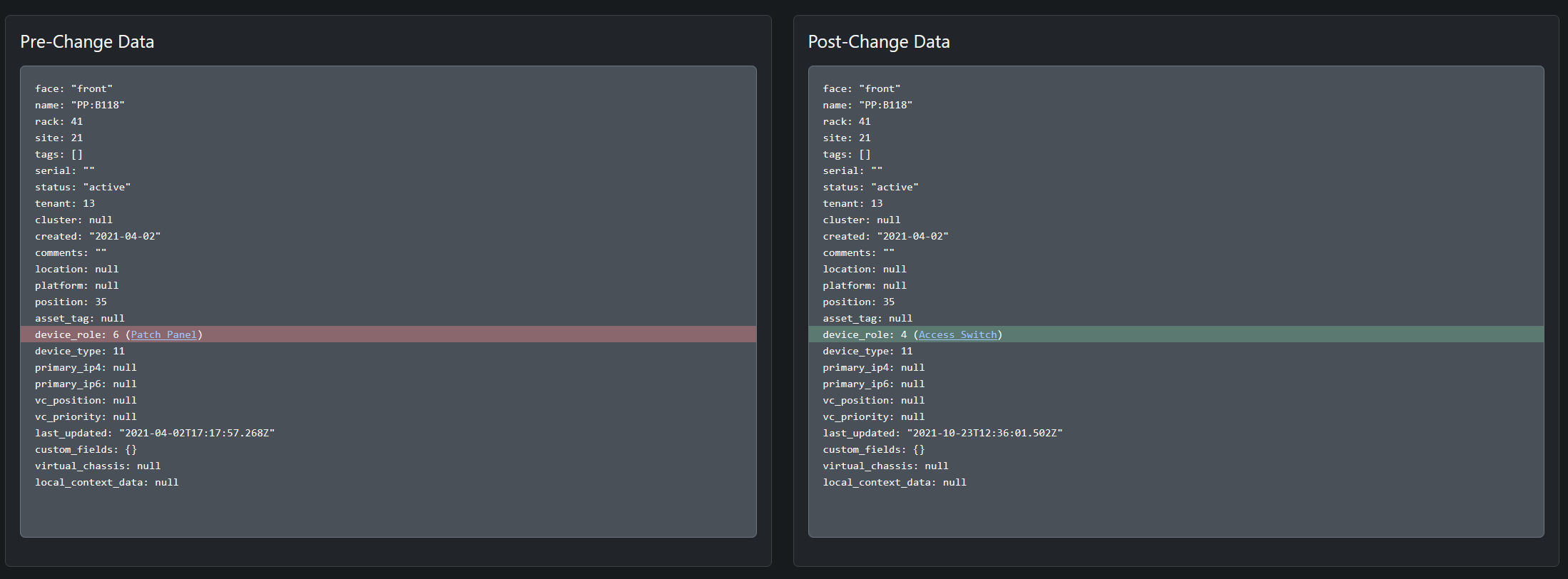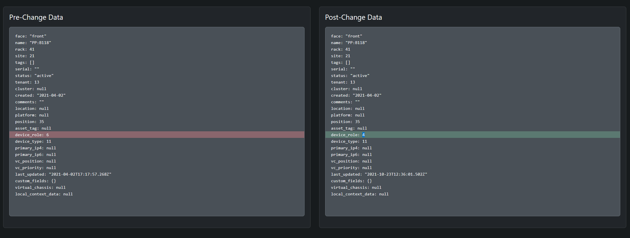 for example if you go to devices and change device role for specific device diff you get in change log is like it was 6 and now it's 4 and there is no good way to see what that means