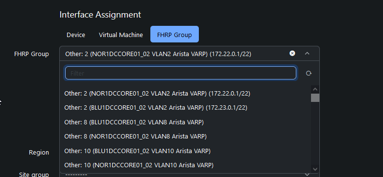 The current select list only shows FHRP type and ID (I am ignoring the assigned IP since in some cases we have lots of assigned IPs... and we cannot choose the "primary" one).