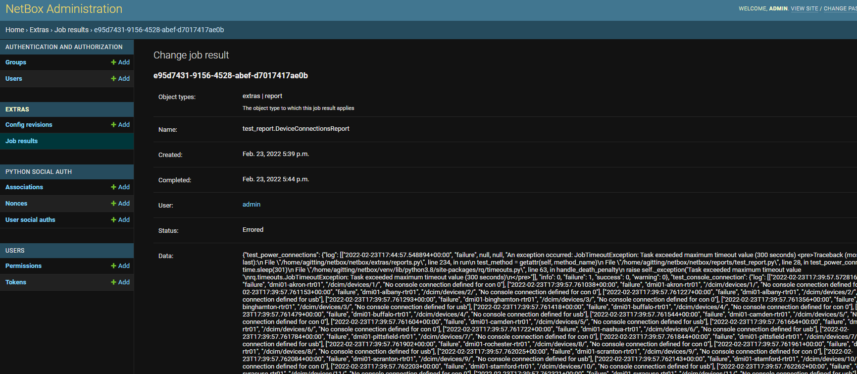 I get different results on different instances. On the test - correct, on the production - no. According to the netbox code, everything seems to be normal. The timeout exception is correctly logged, but the result is not saved. There might be an error in the process of saving the result of the task. Maybe a large size of the report results? But there is nothing in the logs to indicate this. I will investigate the issue further.