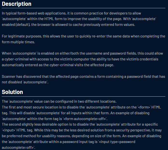 @jvaltrick All major browsers ignore autocomplete=off if the form contains username/password fields. Please don't create issues based on automatic security scans, especially if you don't understand the output.