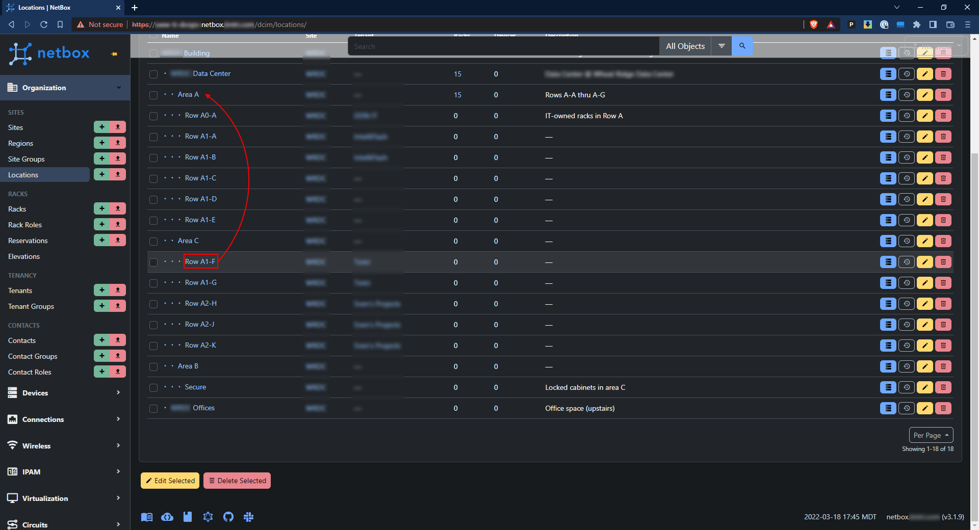 All of the Row A1-* locations were created via CSV import where the parent was set to "Area A".
