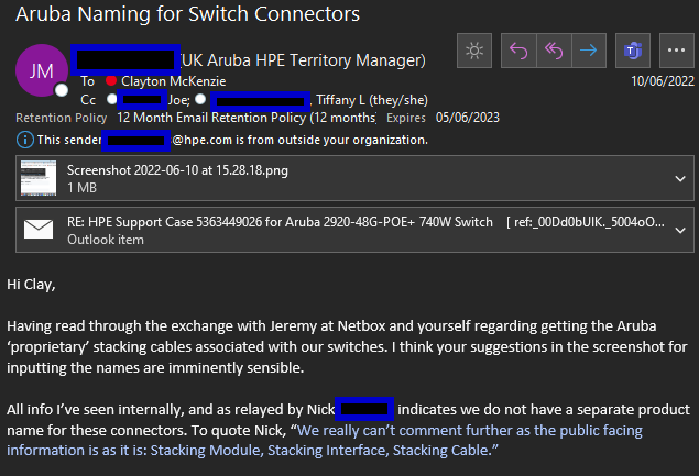 With there failing to be a more elaborate 'public' name for these cables/connectors and Aruba HPE having said that they agree with my descriptions of them, I am at a loss as to how to resolve the hesitance to add the necessary 4 lines of code above.