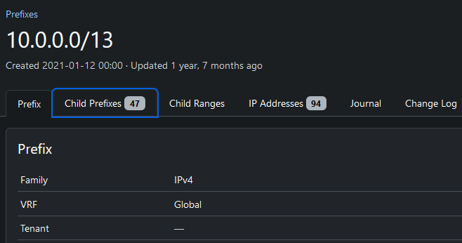 If I then select either the 10.0.0.0/8 prefix or the 10.0.0.0/13 prefix and then select the child prefixes tab, I get the same error provided by @zuokot