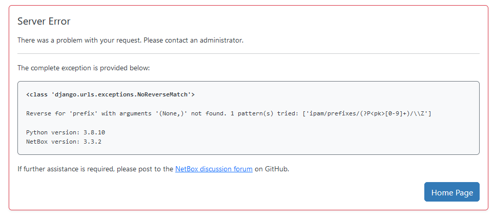 Reverse for 'prefix' with arguments '(None,)' not found. 1 pattern(s) tried: ['ipam/prefixes/(?P[0-9]+)/\Z']
