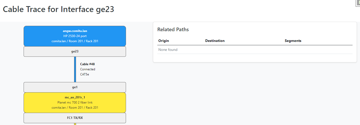 2. Press trace button on network interface ge23 on Switch angw.comita.lan - we got Related Paths table empty