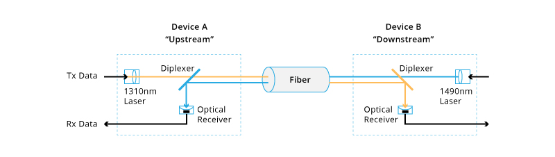 BiDi modules are equipped with WDM couplers/diplexers to combine or separate data transmitted over a single fibre using different wavelengths of light. Like traditional transceivers, BiDi transceivers should be deployed in pairs. However, for BiDis, we should use two modules: one for the upstream ("U") direction and another for the downstream ("D")—each part transmits at an opposite wavelength. For example, from point A we have installed a transceiver that transmits TX on 1310nm towards point B on a single fibre. In point B there is a transceiver that receives RX on 1310 nm and transmits back to point A on 1490nm on the same fibre. In point A the RX frequency is listening on 1490nm.