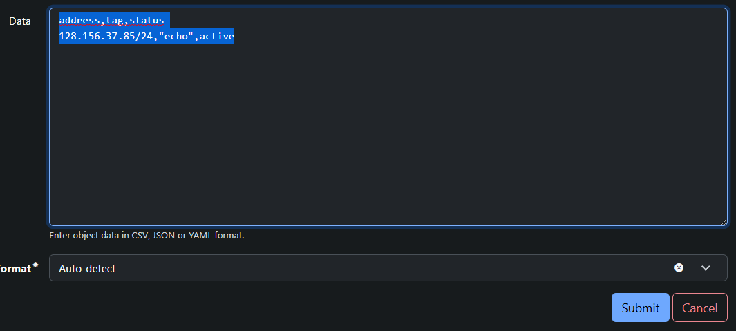address,tag,status 148.156.37.85/24,echo,activeVariation 3: